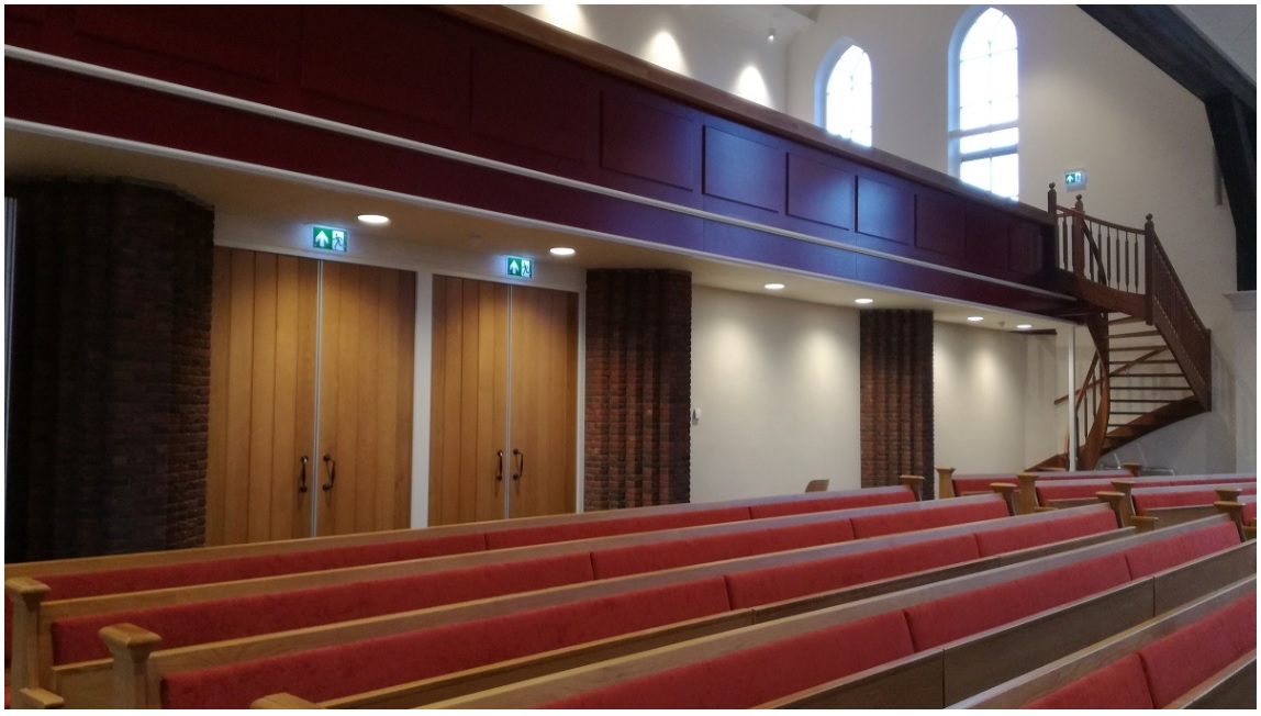 Boele en rietveld heeft een audio installatie aangelegd die in alle nieuwe wensen voldoet. Er liggen diverse doven-ringleidingen in de cementvloer die uiterst zorgvuldig zijn aangelegd om het geluid zo goed mogelijk over te brengen. Samen met een camera en beamer aansluitingen kunnen de diensten perfect op afstand te zien en te beluisteren zijn.